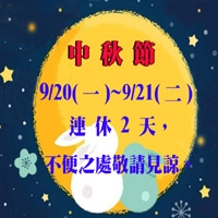2021 中秋節於9/20(一)~9/21(二)連休2天,不便之處敬請見諒。 -