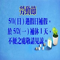 2022 勞動節於5/1 (日)遇假日補假,5/2(一)補休一天,不便之處敬請見諒。 -
