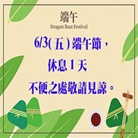 2022 端午節於6/3(五)休息1天,不便之處敬請見諒。 -