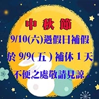 2022 中秋節9/10(六) 遇假日補假,於9/9(五)補休1天,不便之處敬請見諒。 -